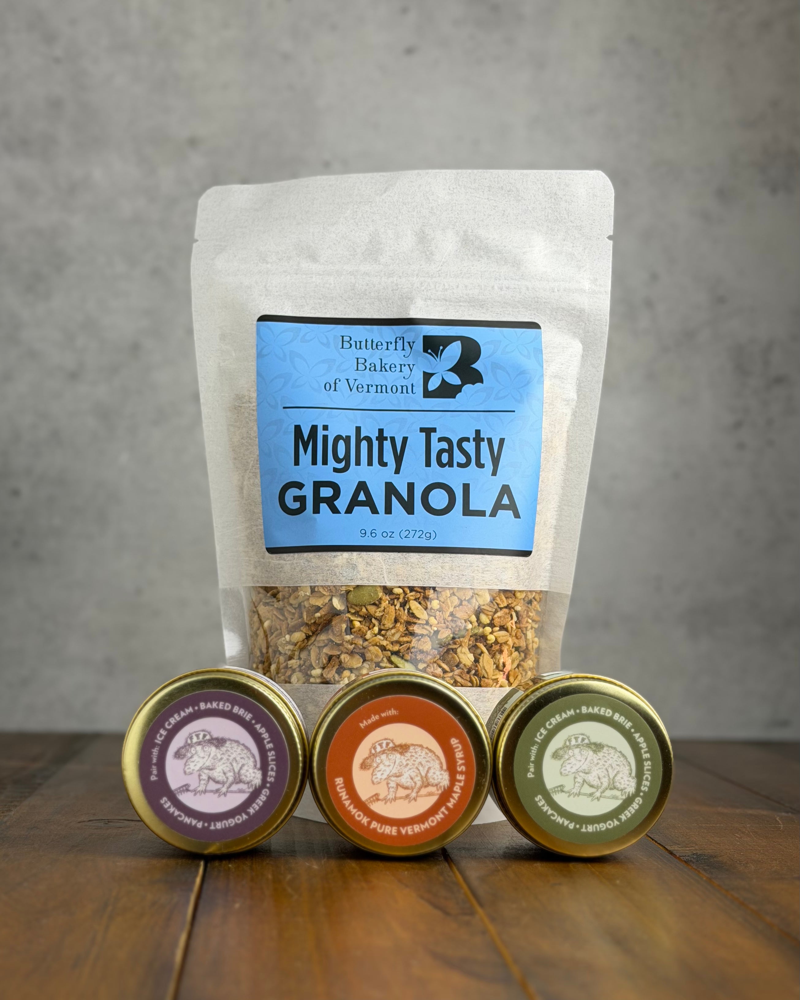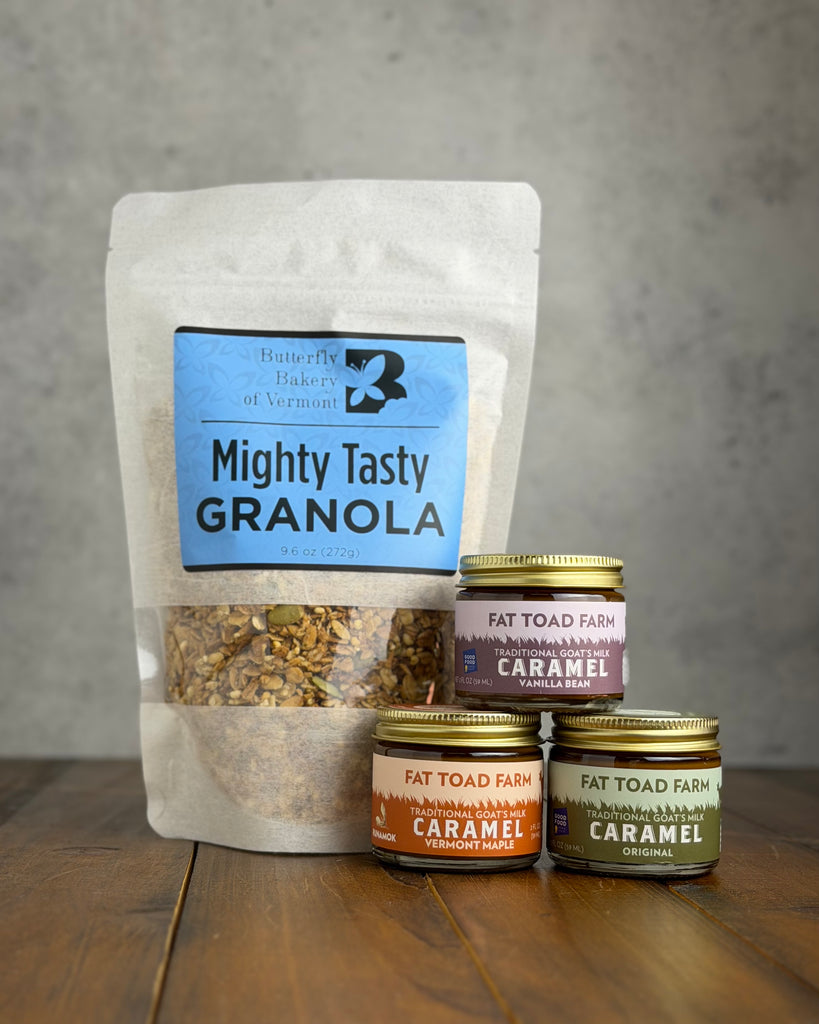 Take your parfait game to the next level with this thoughtfully curated selection of of granola and delicious accompaniments. Pair our best-selling Mighty Tasty granola with a selection of three delicious Fat Toad Farm caramels, and all you need is your favorite local yogurt. Whether you’re crafting a breakfast masterpiece or a dessert treat, this set makes building the perfect parfait effortless and enjoyable.