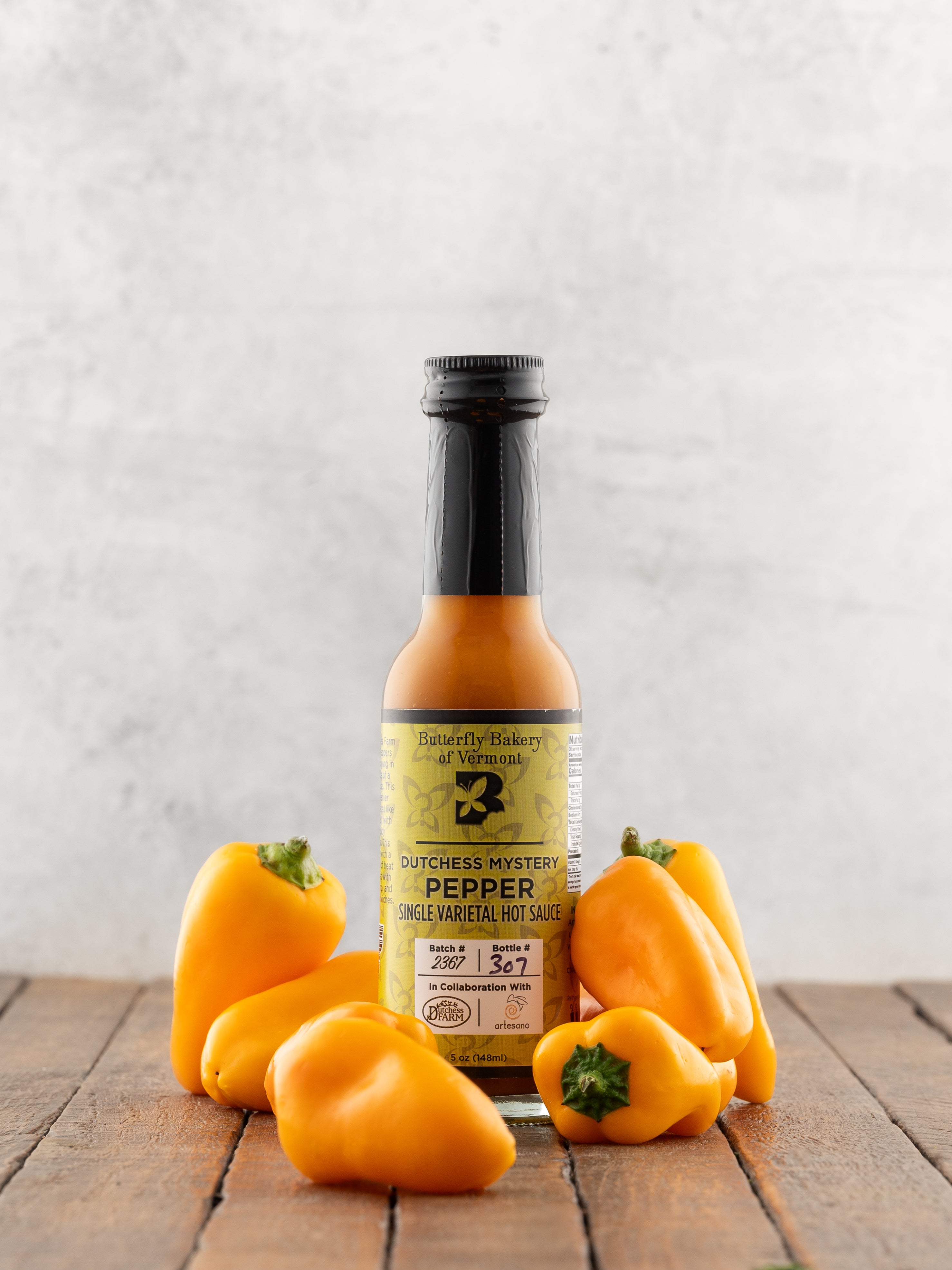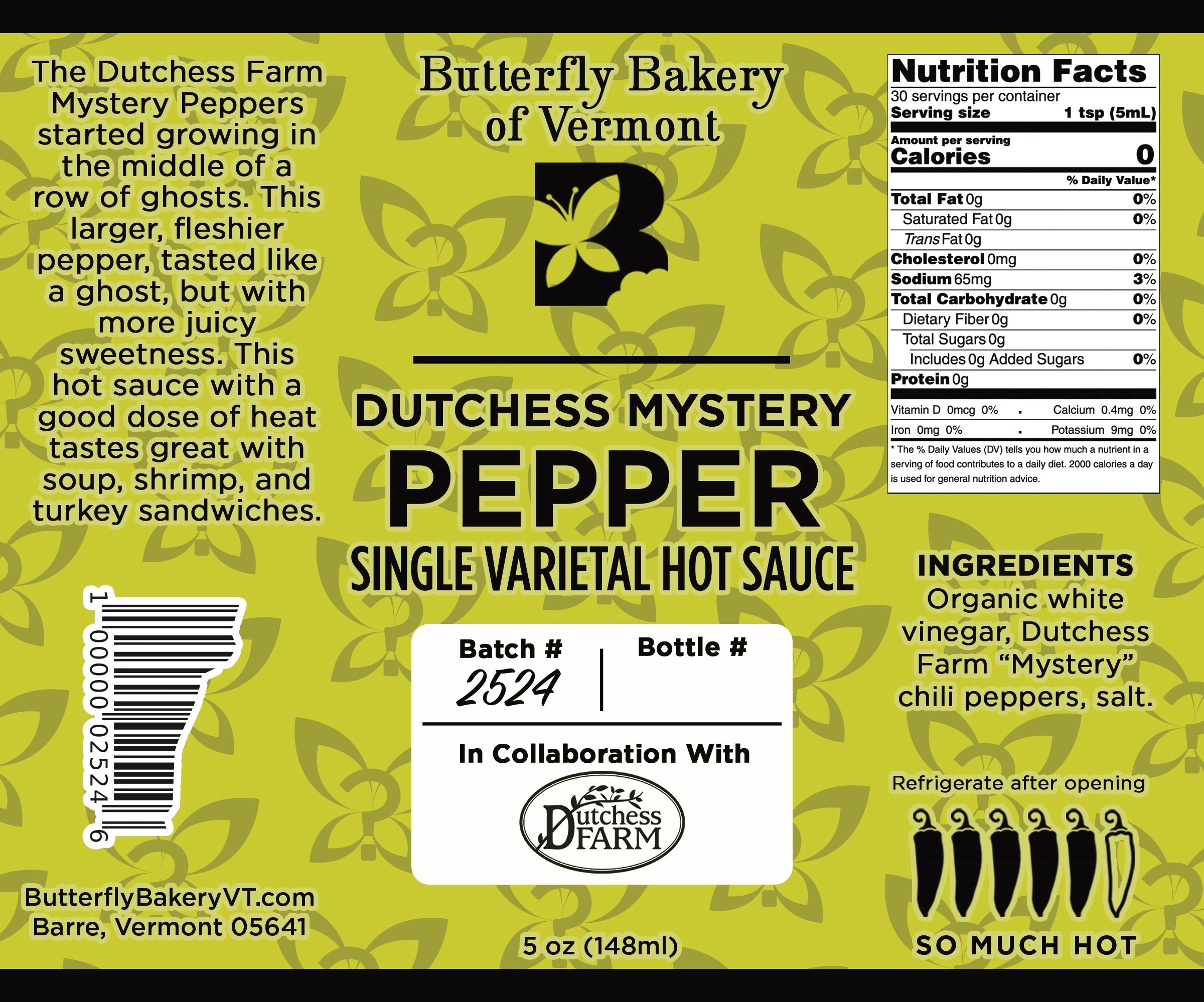 The Dutchess Farm Mystery Peppers started growing in the middle of a row of ghosts. This larger, fleshier pepper, tasted like a ghost, but with more juicy sweetness. This hot sauce with a good dose of heat tastes great with soup, shrimp and turkey sandwiches.