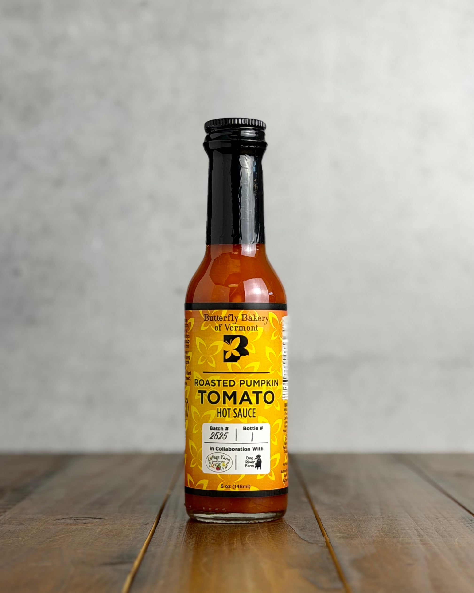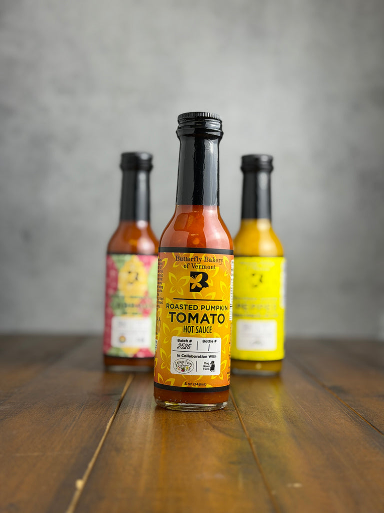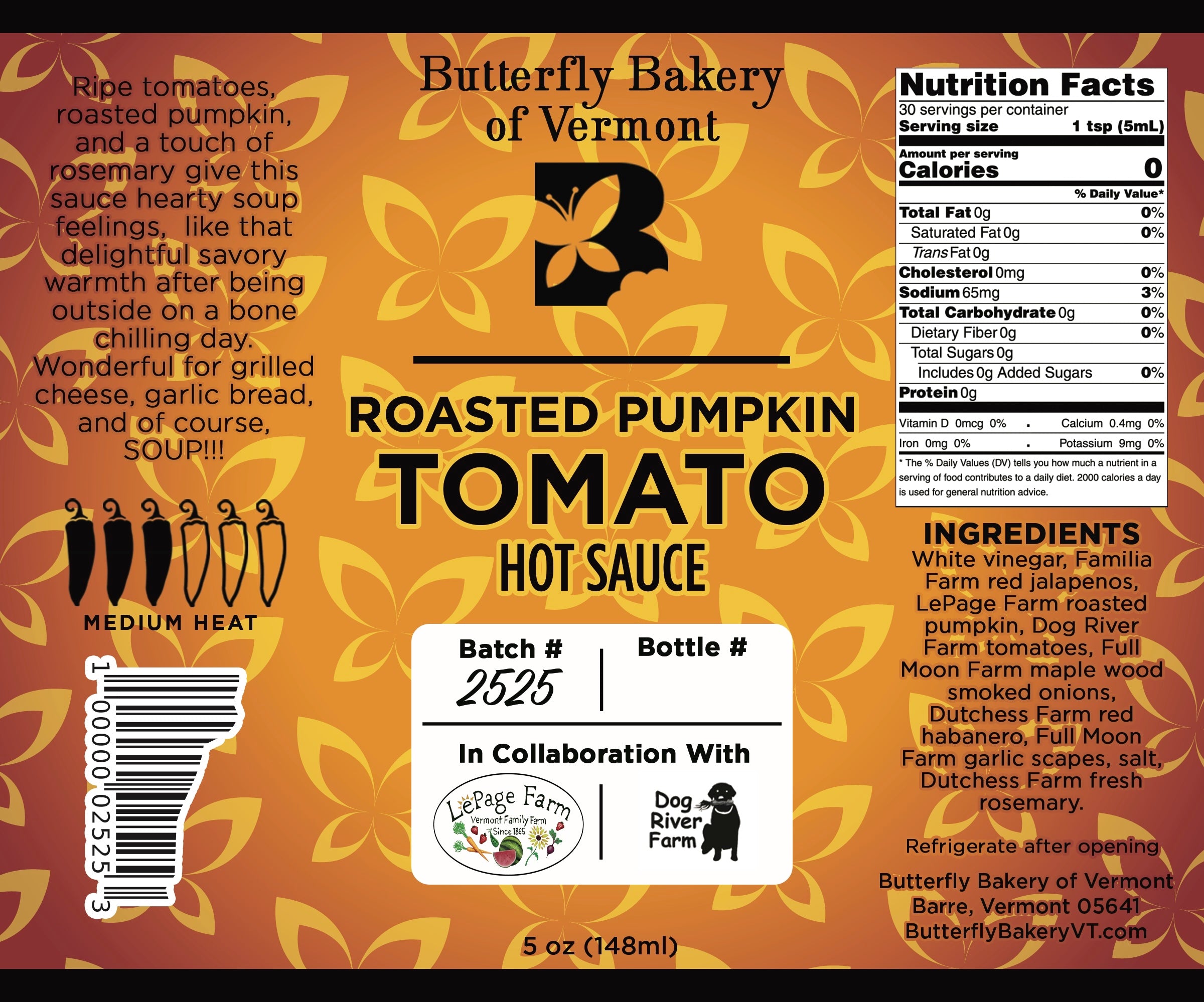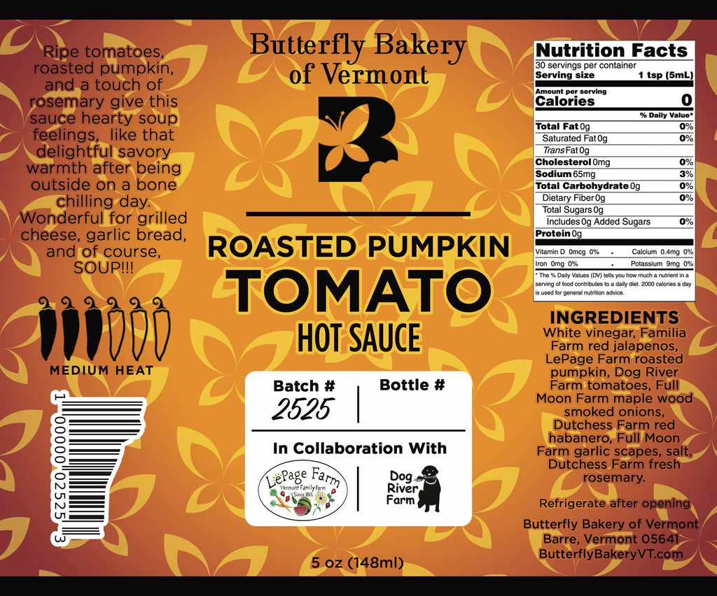 Ingredients: White vinegar, Familia Farm red jalapenos, LePage Farm roasted pumpkin, Dog River Farm tomatoes, Full Moon Farm maple wood smoked onions, Dutchess Farm red habanero, Full Moon Farm garlic scapes, salt, Dutchess Farm fresh rosemary.