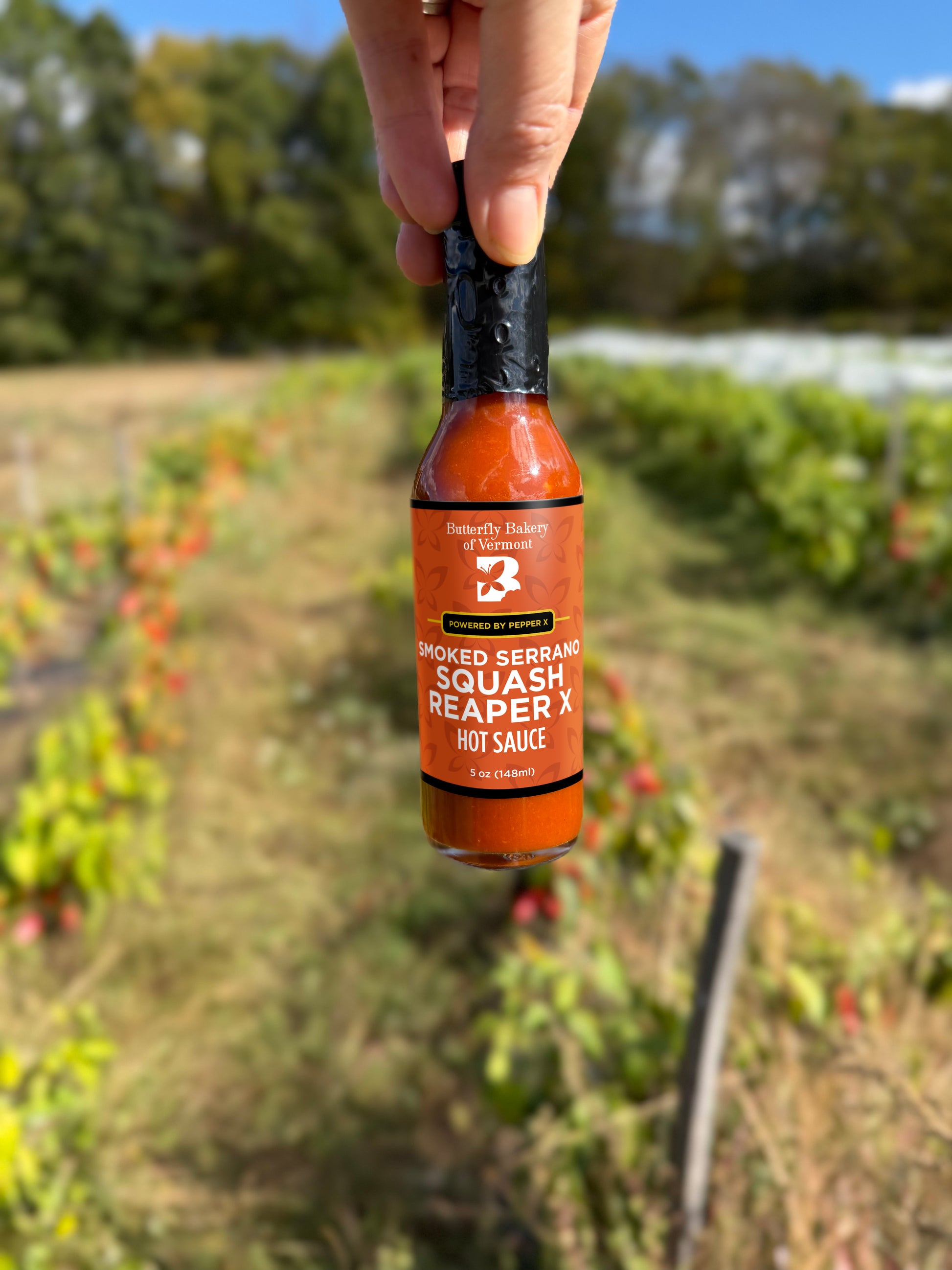Chili peppers* (serranos, reapers, ghosts), vinegar, butternut squash*, tomato*, smoked onion juice*, ground reaper pepper, ground pepper x.