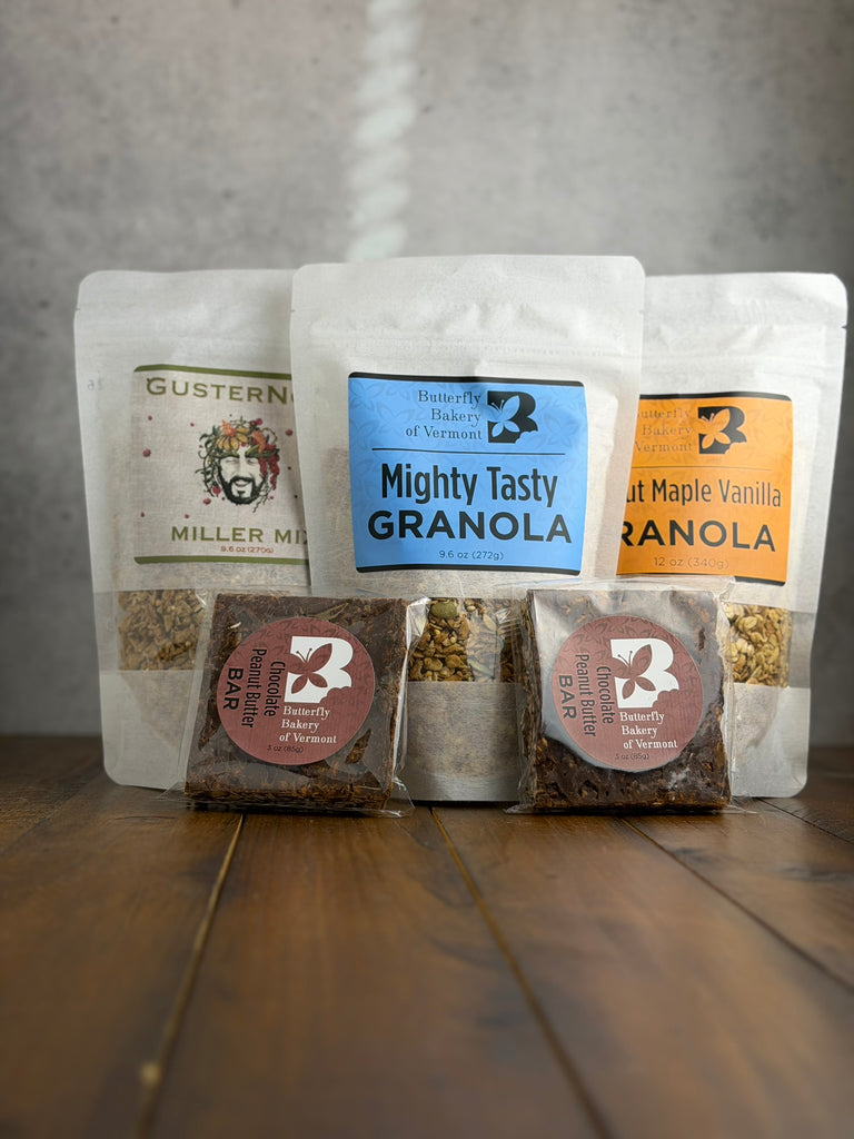 - 9.6 oz bag of Mighty Tasty granola- 9.6 oz bag of Miller Mix Gusternola- 12 oz bag of Peanut Maple Vanilla granola- 2 Chocolate Peanut Butter bars