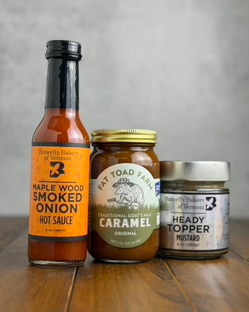 Transform your charcuterie boards with this premium selection of sweet and savory condiments. Featuring Butterfly Bakery of Vermont handcrafted mustard and hot sauce along with our Fat Toad Farm goat's milk caramel, this set is designed to elevate every bite. Perfect for pairing with fine cheeses and cured meats with crackers, this set makes a great gift for hosts, foodies, or anyone who loves entertaining with style.