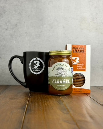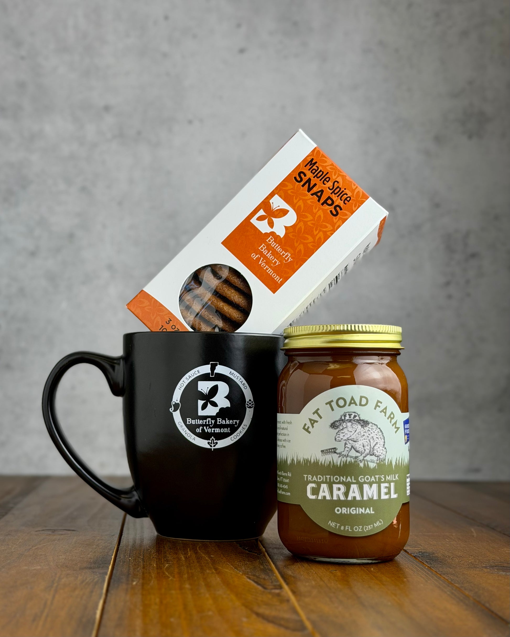 Embrace the chill of the colder months ahead with our Cozy Tea Set, designed to bring warmth and comfort to those frosty days. Featuring a box of delightfully crunchy Maple Spice snaps and a jar of delicious Original Fat Toad Farm goat’s milk caramel along with our perfectly sized Butterfly Bakery of Vermont logo mug, this set is perfect for chilly mornings and cozy moments by the fire.