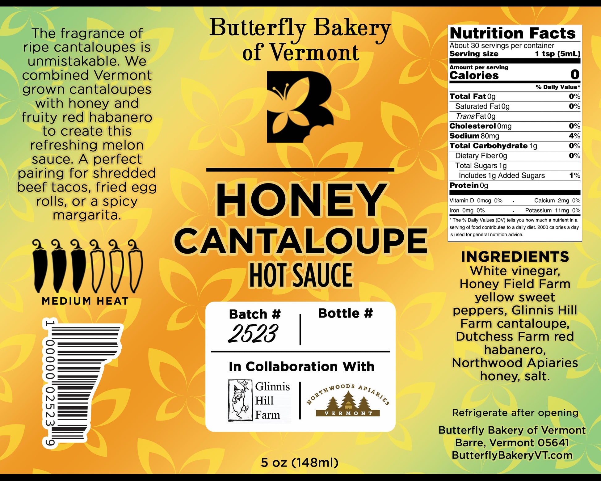 The fragrance of ripe cantaloupes is unmistakable. We combined Vermont grown cantaloupes with honey and fruity red habanero to create this refreshing melon sauce. A perfect pairing for shredded beef tacos, fried egg rolls, or a spicy margarita.