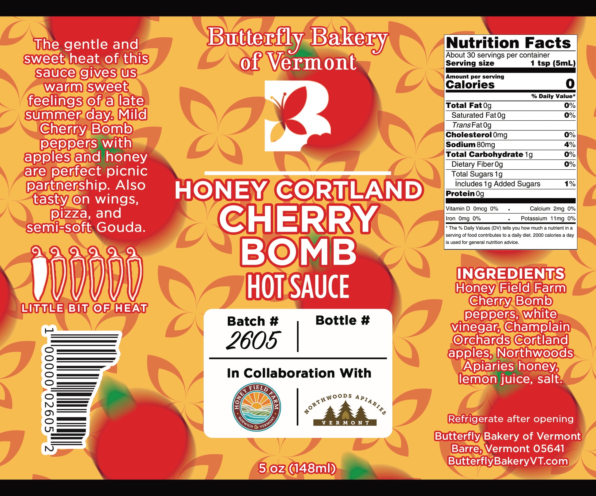 Honey Cortland Cherry Bomb: Honey Field Farm Cherry Bomb peppers, white vinegar, Champlain Orchards Cortland apples, Northwoods Apiaries honey, lemon juice, salt.