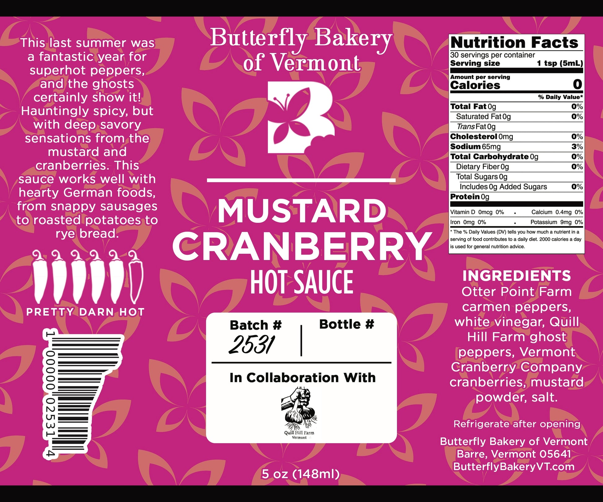 Otter Point Farm carmen peppers*, white vinegar, Quill Hill Farm ghost peppers*, Vermont Cranberry Company cranberries*, mustard powder, salt.
