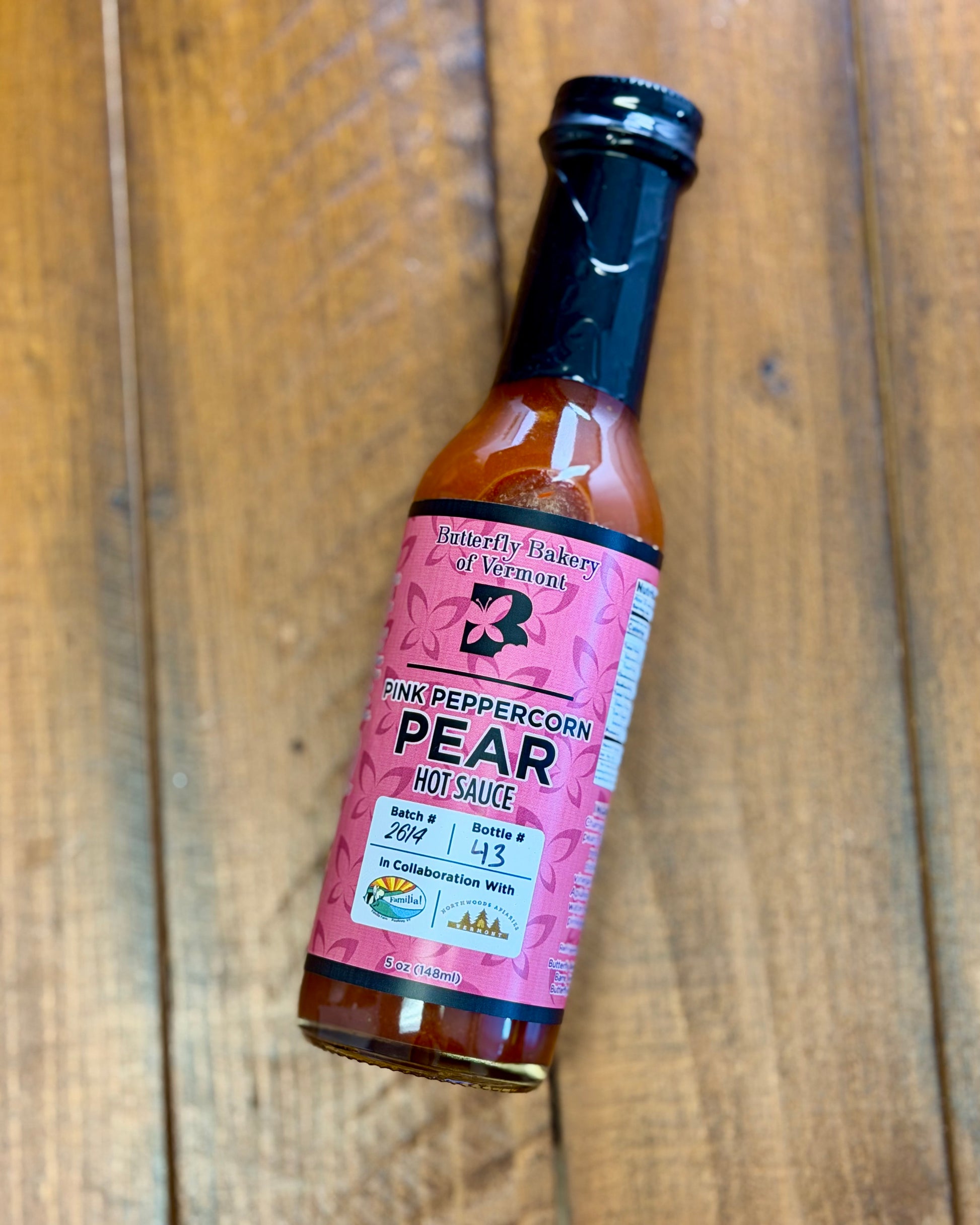 Ingredients: Champlain Orchards pears, Familia Farm red serranos, distilled white vinegar, Northwoods Apiaries honey, salt, water, fresh ground pink peppercorns.