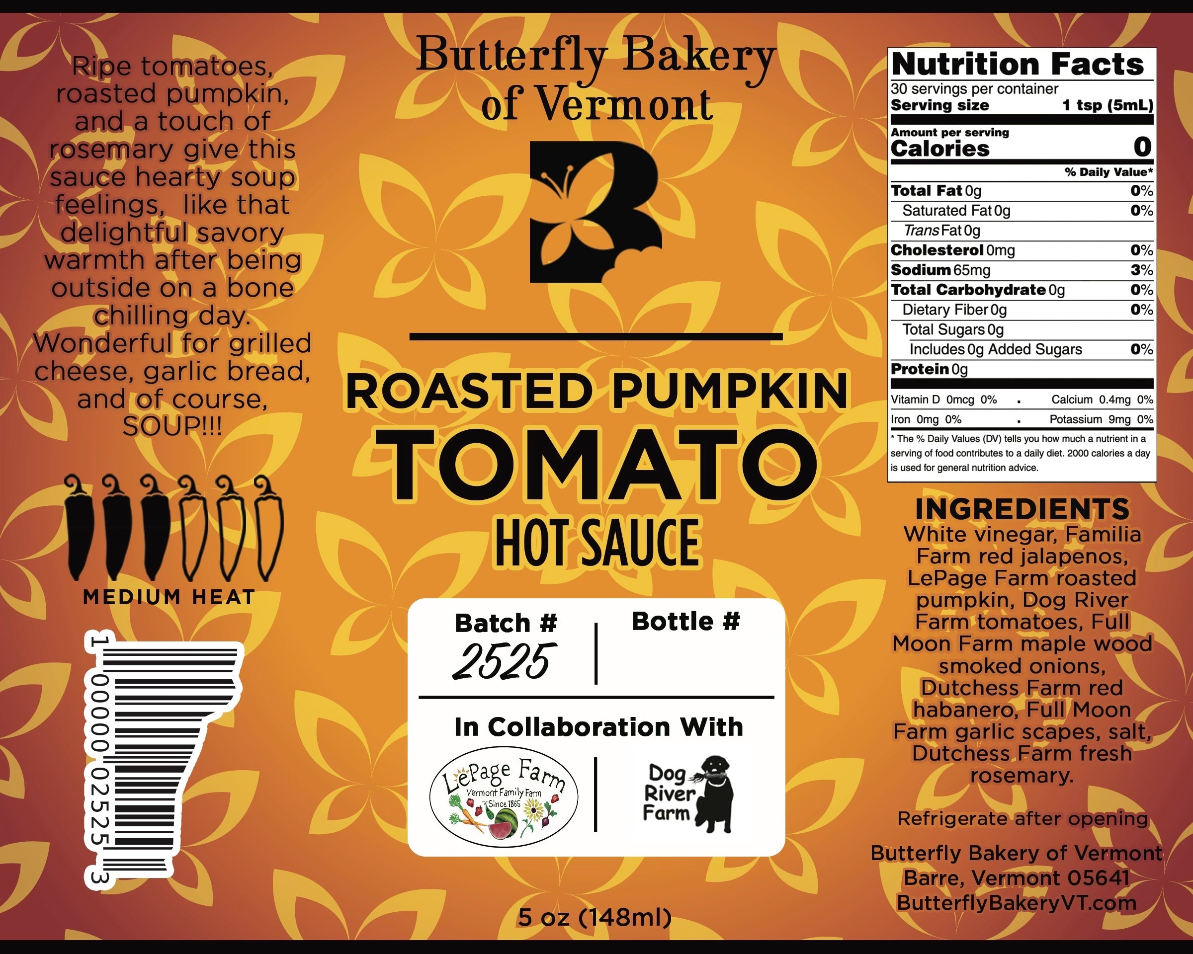 Ingredients: White vinegar, Familia Farm red jalapenos, LePage Farm roasted pumpkin, Dog River Farm tomatoes, Full Moon Farm maple wood smoked onions, Dutchess Farm red habanero, Full Moon Farm garlic scapes, salt, Dutchess Farm fresh rosemary.