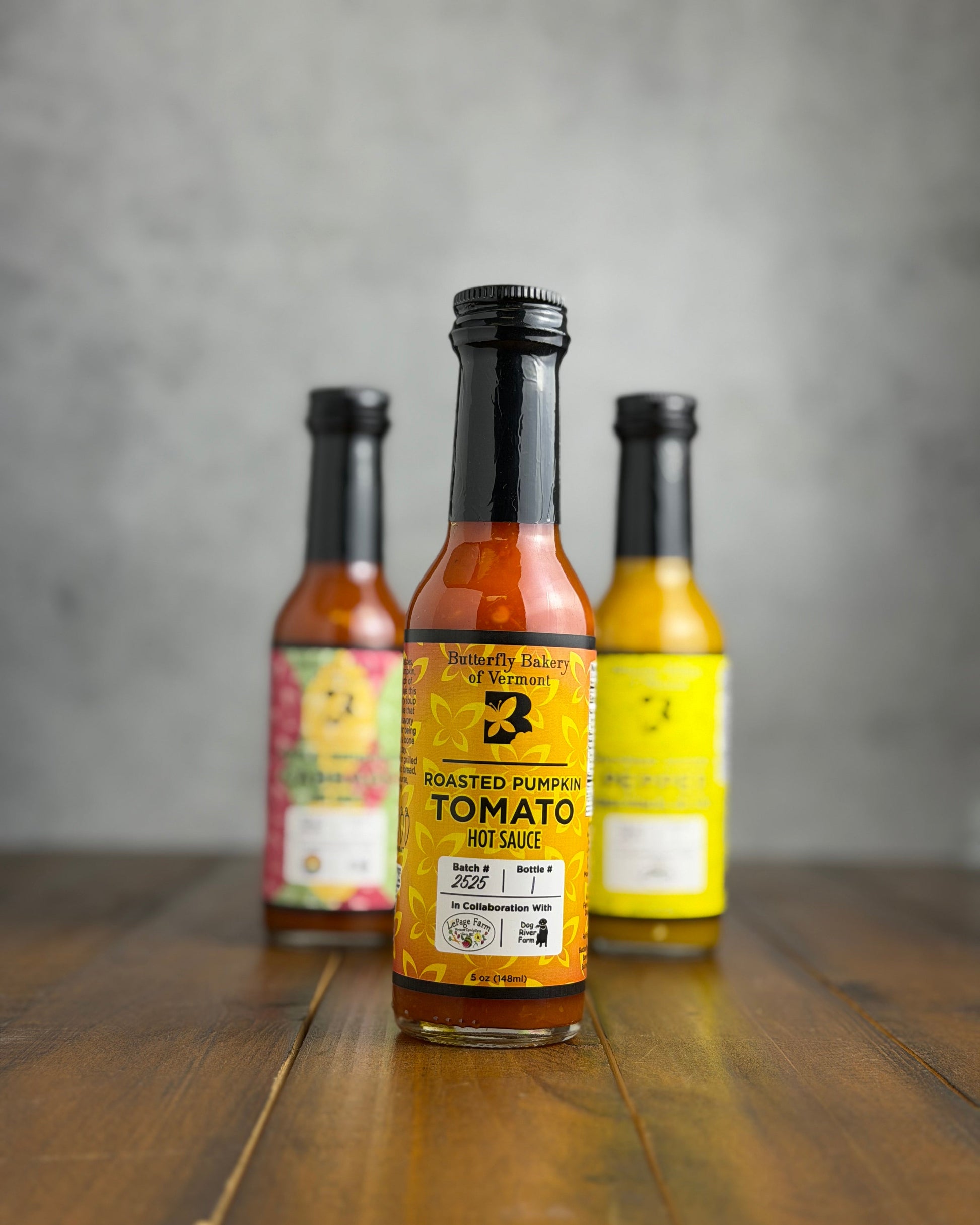 White vinegar, Familia Farm red jalapenos, LePage Farm roasted pumpkin, Dog River Farm tomatoes, Full Moon Farm maple wood smoked onions, Dutchess Farm red habanero, Full Moon Farm garlic scapes, salt, Dutchess Farm fresh rosemary.
