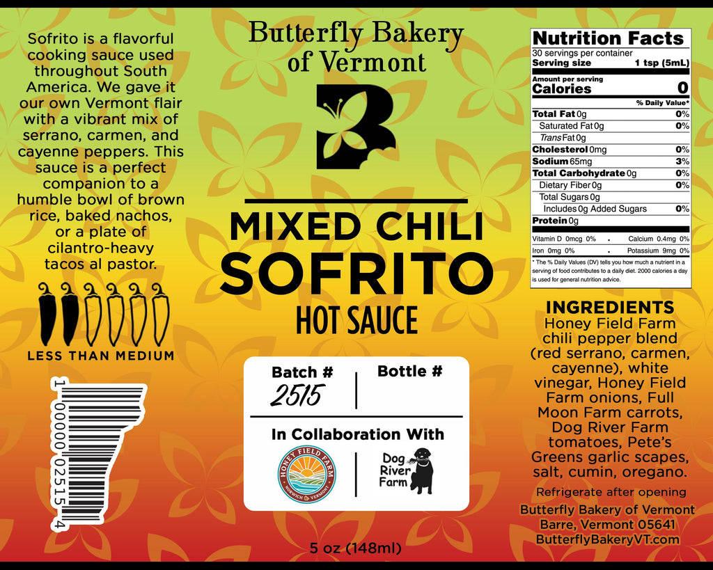 Sofrito is a flavorful cooking sauce used throughout South America. We gave it our own Vermont flair with a vibrant mix of serrano, carmen, and cayenne peppers. This sauce is a perfect companion to a humble bowl of brown rice, baked nachos, or a plate of cilantro-heavy tacos al pastor.