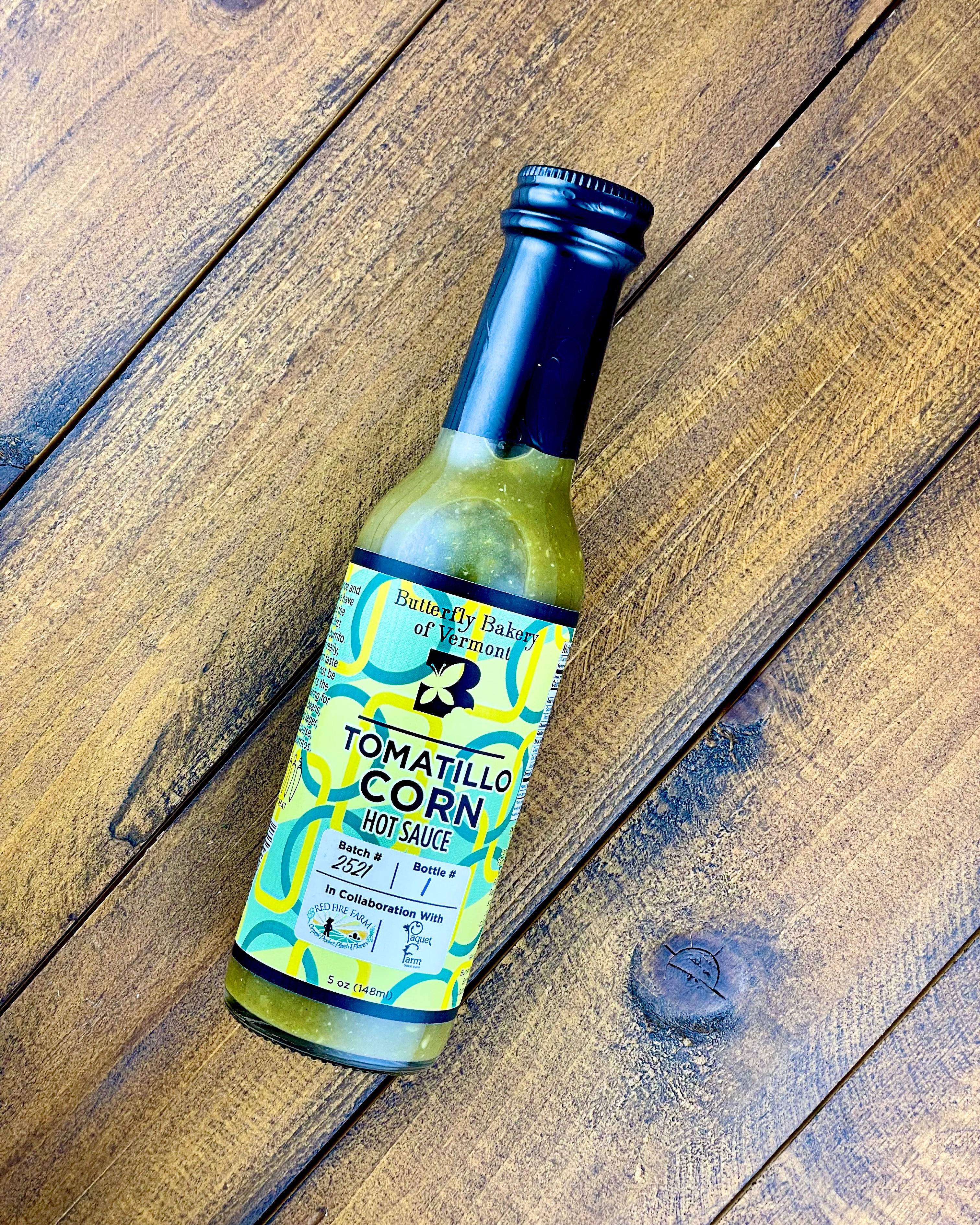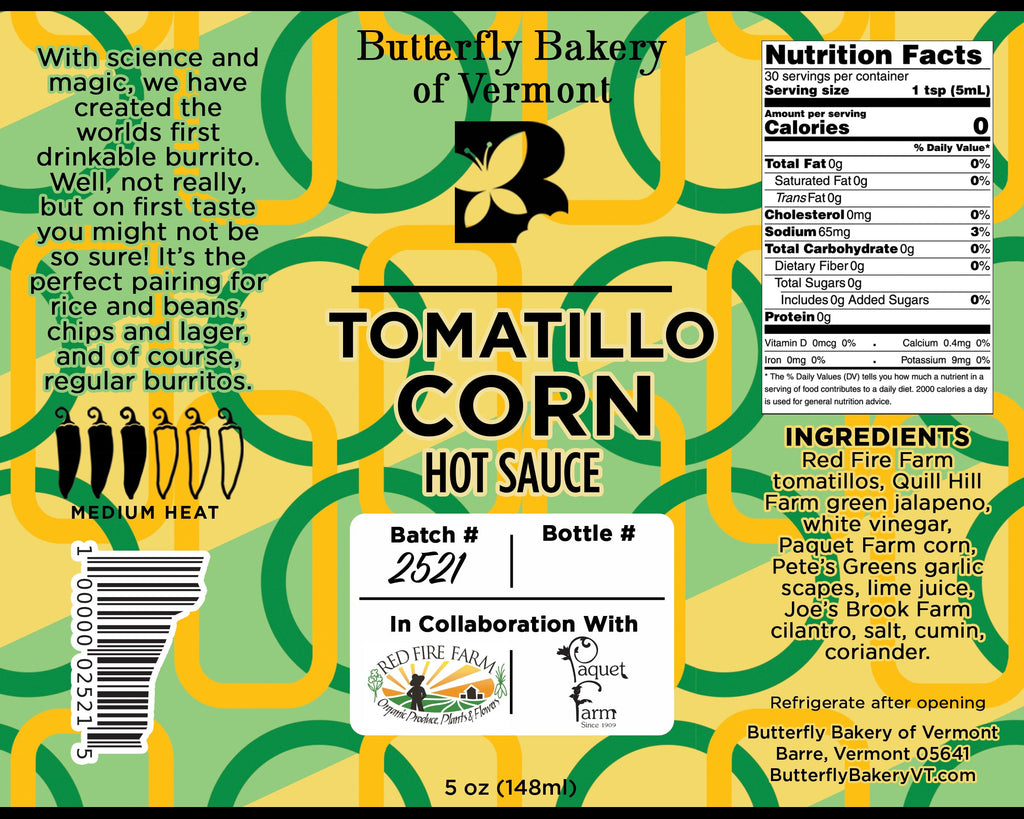 Red Fire Farm tomatillos, Quill Hill Farm green jalapeno, white vinegar, Paquet Farm corn, Pete's Greens garlic scapes, lime juice, Joe's Brook Farm cilantro, salt, cumin, coriander.